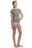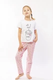 Домашній комплект для дівчаток складається з легінсів однотонного кольору та кофти з яскравим принтом.