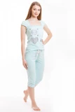 Футболка з V-подібним вирізом, який оброблений тонким і витонченим мереживом. Короткий рукав прикриває плече та трохи руку. У футболки прямий крій. Її низ та краї рукавів оздоблені так само, як і бриджі.